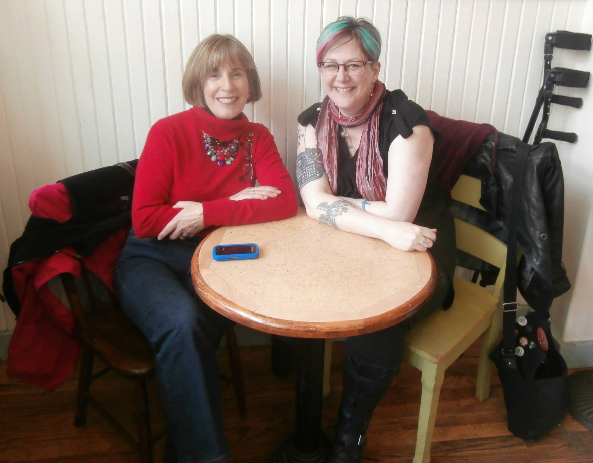 I got to see Bonnie again this weekend, as she was in town for The Writers’ Union of Canada annual general meeting . I am not a TWUC member, so we sneaked off for a somewhat illicit lunch, joined by her lovely husband, who took the photo of us I’ve posted here.