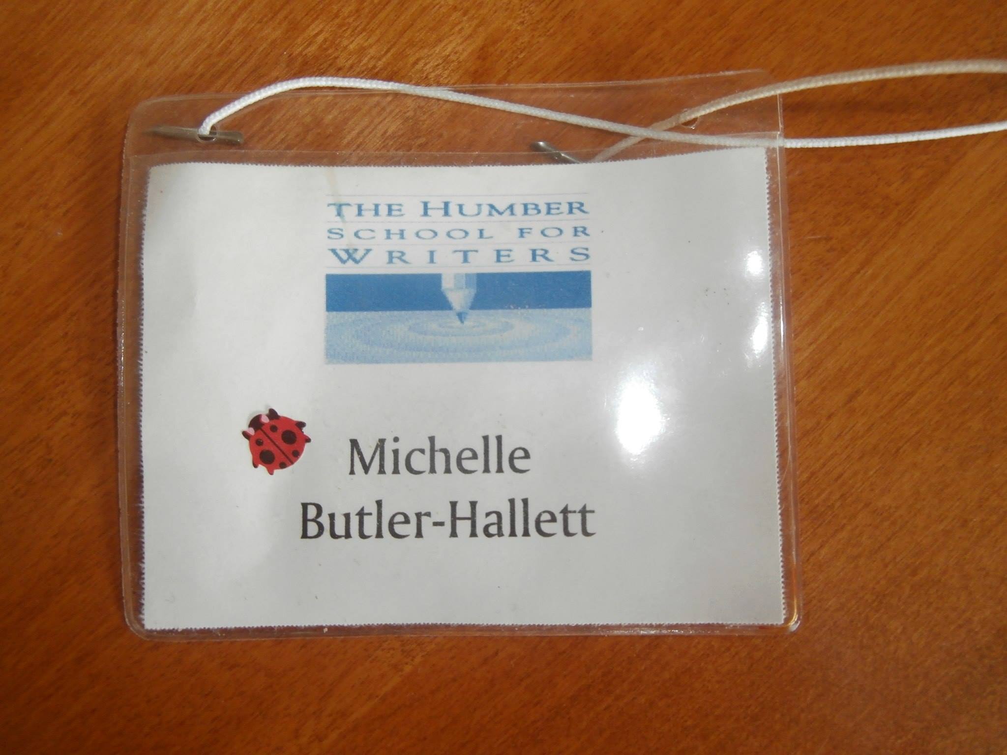 The writing students got assigned to a mentor, who would evaluate manuscripts and lead morning workshops. When applying, we could indicate our first choice of mentor. I can’t recall who I asked for. I hoped a faint hope to get to meet Alistair MacLeod and say I admired his work. My father was paying for the workshop, which included residence and some food; I jumped into a debt hole to pay my airfare, while my husband was unemployed: super-responsible, no? Things worked out okay. I got in, got a scholarship, and got assigned to a mentor whose work I knew and respected. On Sunday, we all got lanyards with our names and animal stickers on them, animals indicating which group we were in. I still have mine — a ladybug. I also got a fright when MacLeod, meeting us all for the first time, addressing us all by surname, fixed his eyes on me and rumbled: “Butler Hallett. Hmm, yes. I know who YOU are.”